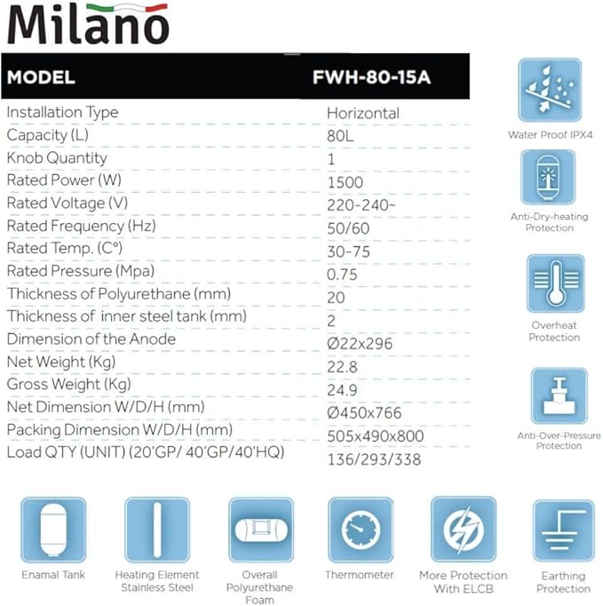 Enjoy endless hot water with the Milano Horizontal Electric Water Heater (80 Litres), finished in a stylish white that blends seamlessly into any modern bathroom. This instant hot water heater offers reliable and efficient performance, making it the ideal solution for larger households, multiple bathrooms, or high-demand water needs. With an 80-litre capacity, this electric water heater ensures you have enough hot water for multiple users at once, whether it’s for a shower, bath, or household chores. The Blue Diamond inner tank technology enhances the durability of the heater, providing superior corrosion resistance and excellent heat retention, ensuring your water stays hot longer and the tank remains protected. The horizontal design of the Milano water heater is perfect for bathrooms with limited vertical space, offering a practical solution without compromising on capacity. Measuring 45×76.6×76.6×45 cm, this wall-mounted water heater fits neatly into a variety of bathroom layouts, saving valuable space while delivering excellent performance. Equipped with advanced safety features, this Milano Horizontal Electric Water Heater ensures safe operation by preventing overheating and electrical hazards, giving you peace of mind with every use.