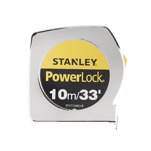 Stanley Powerlock Measuring Tape has Spring return 25mm wide, durable, chrome plated plastic case. Unique MYLAR coating protects three colour blade graphics for up to 10 times normal life.